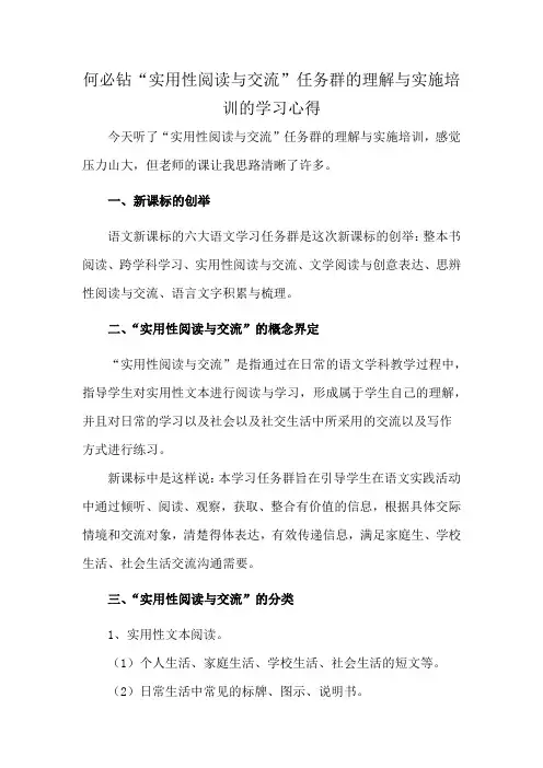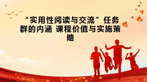 “实用性阅读与交流”任务群的理解与实施作者:吴东来源:《语文建设·上半月》2019年第08期编者按“实用性阅读与交流”是《普通高中语文课程标准(2017年版)》提出的必修课程中的七个任务群之一,旨在引导学生学习当代社会生活中的实用性语文,丰富生活经历和情感体验,提高阅读与表达交流的水平,增强适应社会、服务社会的能力。