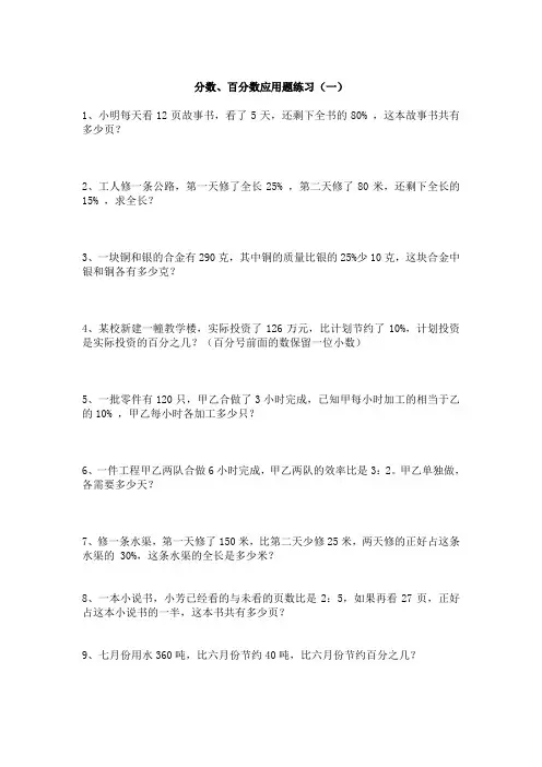 分数、百分数应用题练习(一)1、小明每天看12页故事书,看了5天,还剩下全书的80% ,这本故事书共有多少页?2、工人修一条公路,第一天修了全长25% ,第二天修了80米,还剩下全长的15% ,求全长?3、一块铜和银的合金有290克,其中铜的质量比银的25%少10克,这块合金中银和铜各有多少克?4、某校新建一幢教学楼,实际投资了126万元,比计划节约了10%,计划投资是实际投资的百分之几?(百分号前面的数保留一位小数)5、一批零件有120只,甲乙合做了3小时完成,已知甲每小时加工的相当于乙的10% ,甲乙每小时各加工多少只?6、一件工程甲乙两队合做6小时完成,甲乙两队的效率比是3:2。