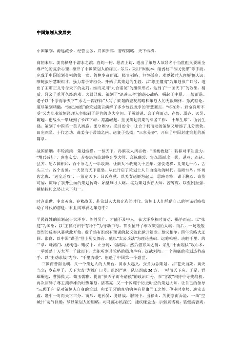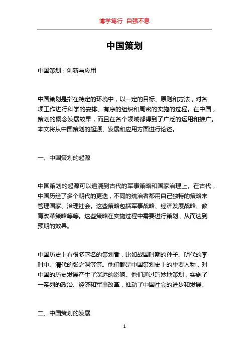 二、中国策划的发展随着社会的发展和进步,中国策划也逐渐从军事和政治上扩展到了其他领域。