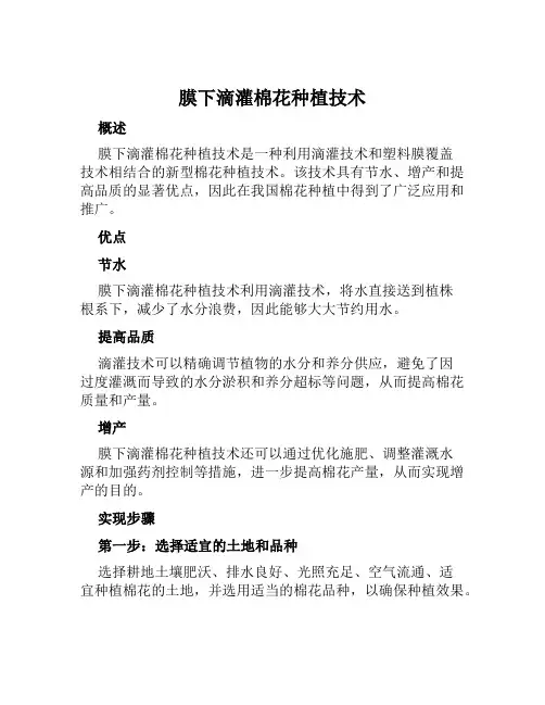 膜下滴灌棉花种植技术概述膜下滴灌棉花种植技术是一种利用滴灌技术和塑料膜覆盖技术相结合的新型棉花种植技术。