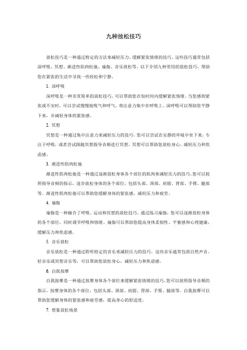 九种放松技巧放松技巧是一种通过特定的方法来减轻压力、缓解紧张情绪的技巧。