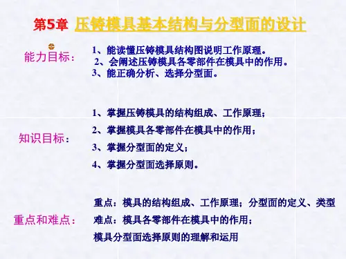 第五章压铸模的基本结构及分型面设计压铸模是保证压铸件质量的重要的工艺装备,它直接影响着压铸件的形状、尺寸、精度、表面质量等。