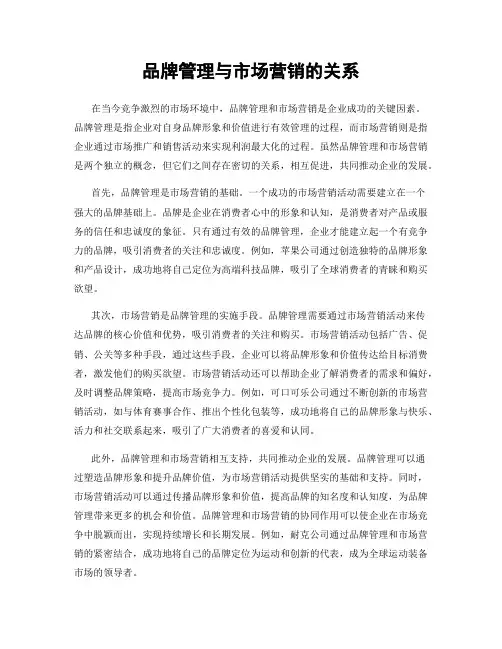 三、市场营销与品牌管理的互动关系市场营销与品牌管理之间存在着密不可分的关系。