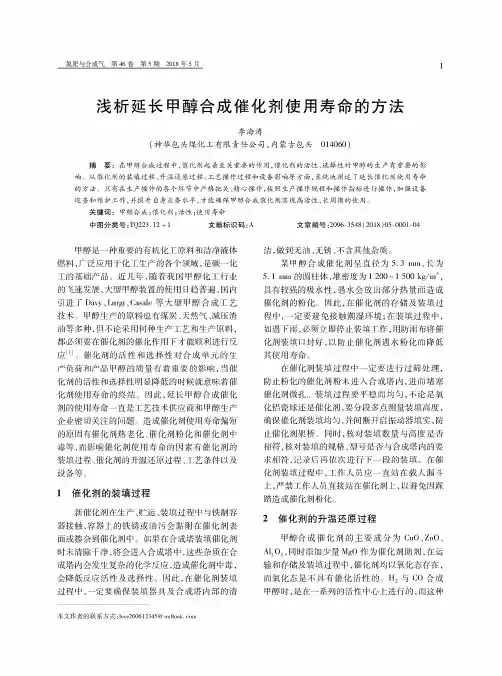 浅析延长甲醇合成催化剂使用寿命的方法李海涛(神华包头煤化工有限责任公司,内蒙古包头014060)摘要:在甲醇合成过程中,催化剂起着至关重要的作用,催化剂的活性、选择性对甲醇的生产有重要的影响。
