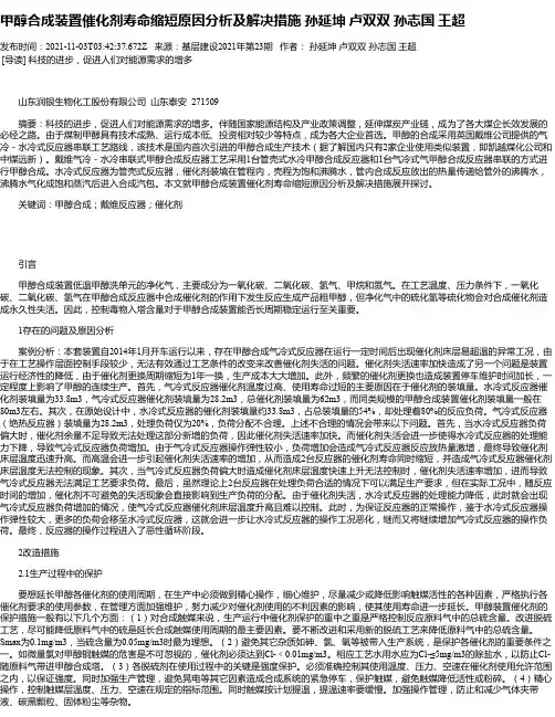甲醇合成催化剂使用寿命问题探析作者:刘吉银来源:《中国化工贸易·下旬刊》2018年第06期摘要:本文通过对甲醇合成催化剂的简介、选择、装填、升温还原、操作优化、维护保养等几方面问题的探析,达到延长其使用寿命的目的。
