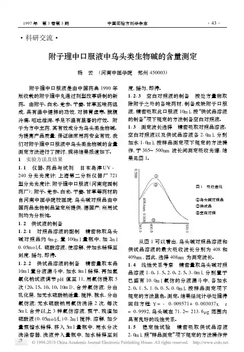 【关键词】附子反相高效液相色谱乌头碱新乌头碱次乌头碱Abstract:ObjectiveTo develop a high performance liquid chromatography (HPLC) method for the determination of three principal alkaloids in aconite root. Methods(4.6mm×250mm, 5μm)column by isocratic elution using Acetonitrile -0.2%Glacial acetic acid (adjusted to pH 7.29 with concentrated ammonia).ResultsThe average recovery of the three alkaloids were analyzed simultaneously with UltimateTM XB-C18 ratesobtained were in the range of 98.93-100.5%for RSD below 2.0%.The linear ranges of aconitine; hypaconitine; mesaconitine were respectively 3.312 5~106 μg/ml, 0.7357~23.5419 μg/ml,1.9661~62.9164μg/ml (r=0.999 9, r=0.999 8, r=0.9997).ConclusionThe contents of alkaloids in aconite root varied significantly from species; hence quality control of aconite root is very necessary.Key words:Aconite root; RP-HPLC; Aconitine; Hypaconitine; Mesaconitine附子为毛茛科植物乌头Aconitum carmichaeli Debx.的子根加工品[1]。