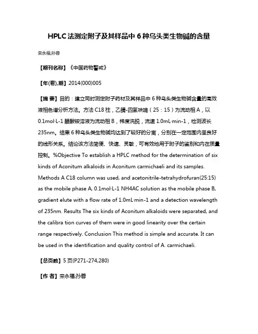 HPLC法测定附子及其样品中6种乌头类生物碱的含量栾永福;孙蓉【期刊名称】《中国药物警戒》【年(卷),期】2014(000)005【摘要】目的:建立同时测定附子药材及其样品中6种乌头类生物碱含量的高效液相色谱分析方法。