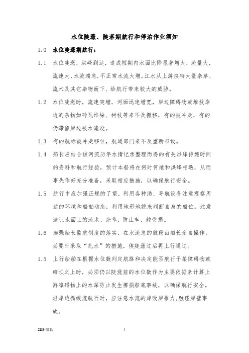 水位陡涨、陡落期航行和停泊作业须知1.0 水位陡涨期航行:1.1 水位陡涨,洪峰到达,造成短期内水面比降显著增大,流量大,流速大,水流湍急,不正常水流大增。