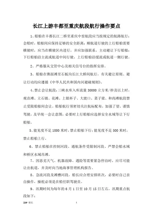长江上游丰都至重庆航段航行操作要点1、船舶在丰都长江二桥至重庆中窑航段应当按规定的航路航行;会船时,船舶间应保持足够的安全距离;顺航道行驶的上行船舶需要横驶时,应当在横驶区内进行,并应加强联系,主动避让下行船舶;下行船舶沿主流或航道中间行驶,上行船舶沿缓流或航道一侧行驶。