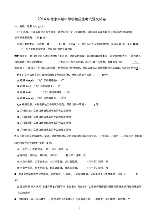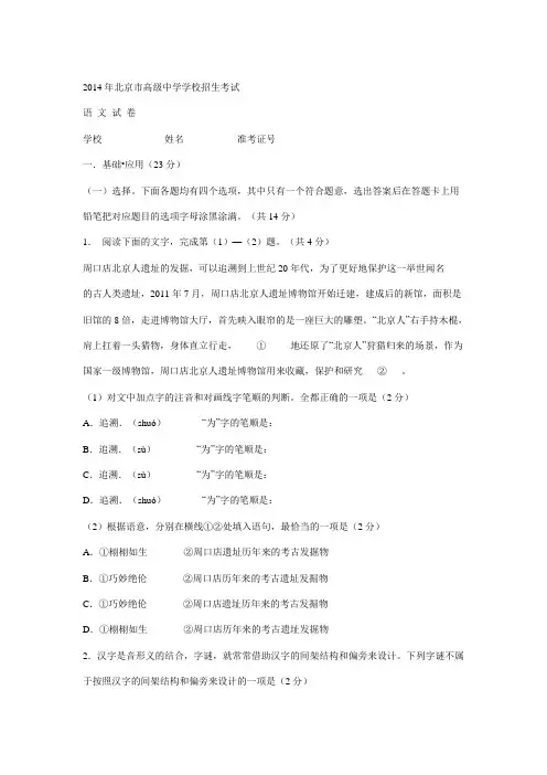 2014年北京市高级中学学校招生考试语文试卷学校姓名准考证号一.基础•应用(23分)(一)选择。