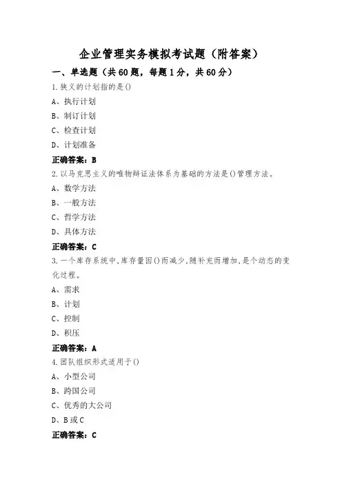 企业管理实务模拟考试题(附答案)一、单选题(共60题,每题1分,共60分)1.狭义的计划指的是()A、执行计划B、制订计划C、检查计划D、计划准备正确答案:B2.以马克思主义的唯物辩证法体系为基础的方法是()管理方法。