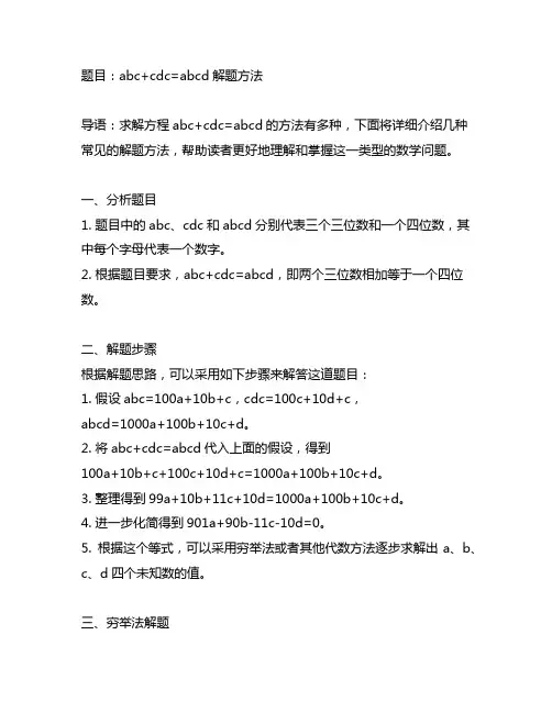 二、解题步骤根据解题思路,可以采用如下步骤来解答这道题目:1. 假设abc=100a+10b+c,cdc=100c+10d+c,abcd=1000a+100b+10c+d。