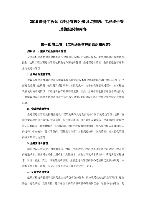 二、2016年造价工程管理的主要内容1. 造价管理的基本概念造价管理是指对工程项目的成本进行全过程的管理控制,包括成本估算、成本控制、成本分析等一系列工作。