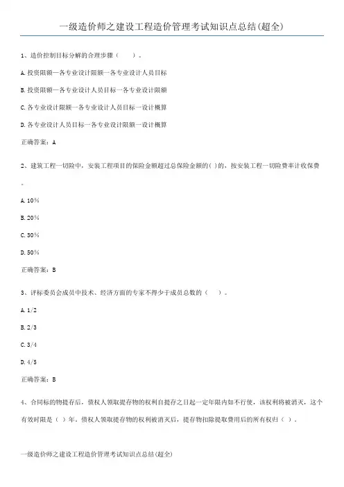一级造价师之建设工程造价管理考试知识点总结(超全)1、造价控制目标分解的合理步骤( )。