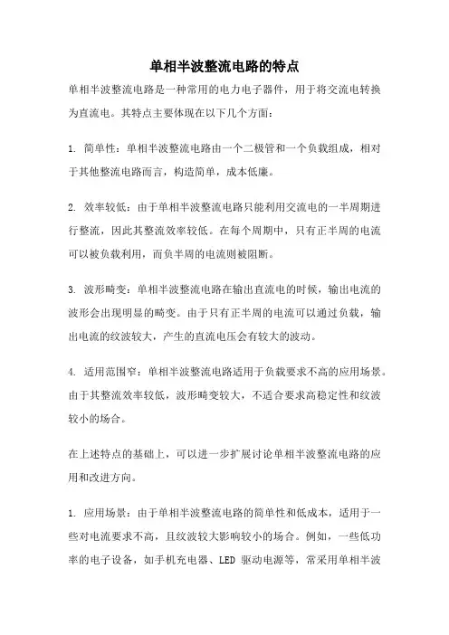 一、单相半波整流电路1. 基本原理单相半波整流电路是一种简单的整流电路,由一个二极管和负载组成。