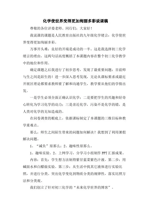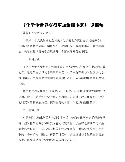 《化学使世界变得更加绚丽多彩》说课稿尊敬的各位评委、老师:大家好!今天我说课的题目是《化学使世界变得更加绚丽多彩》。