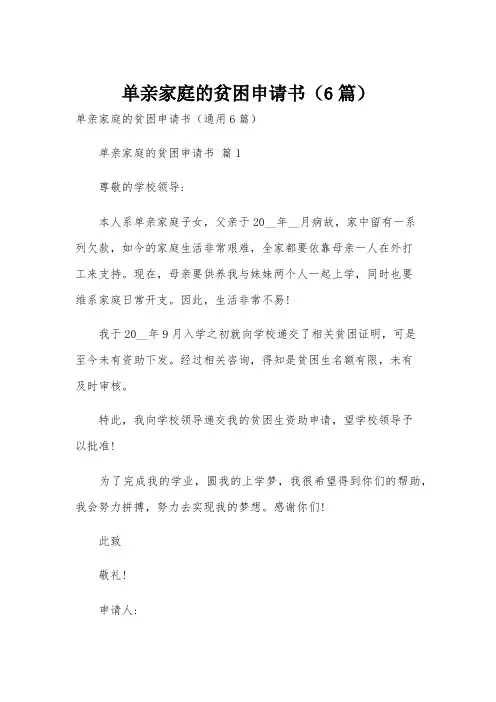 单亲家庭的贫困申请书(6篇)单亲家庭的贫困申请书(通用6篇)单亲家庭的贫困申请书篇1尊敬的学校领导:本人系单亲家庭子女,父亲于20__年__月病故,家中留有一系列欠款,如今的家庭生活非常艰难,全家都要依靠母亲一人在外打工来支持。