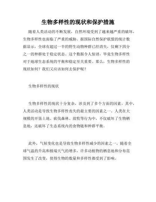 生物多样性的现状和保护措施随着人类活动的不断发展,自然环境受到了越来越严重的破坏,生物多样性也面临了严重的威胁。