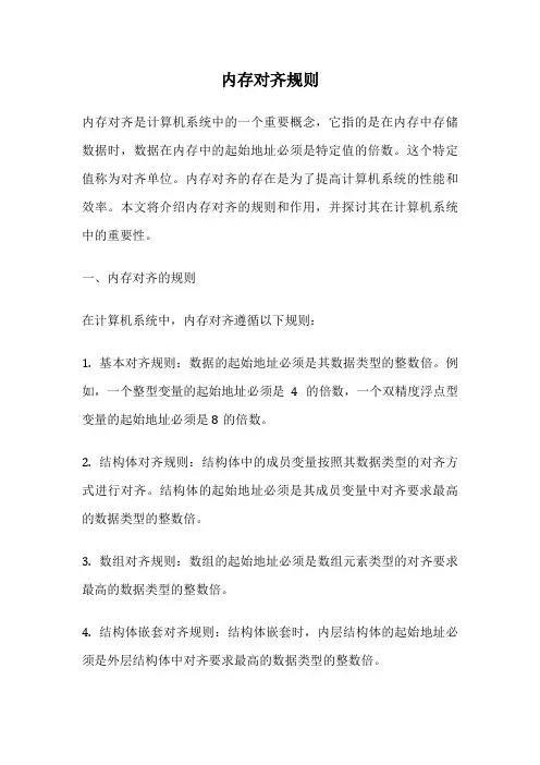 一、内存对齐的规则在计算机系统中,内存对齐遵循以下规则:1. 基本对齐规则:数据的起始地址必须是其数据类型的整数倍。