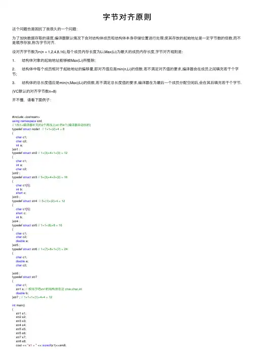 字节对齐原则这个问题也是困扰了我很久的⼀个问题:为了加快数据存取的速度,编译器默认情况下会对结构体成员和结构体本⾝存储位置进⾏处理,使其存放的起始地址是⼀定字节数的倍数,⽽不是顺序存放,称为字节对齐.设对齐字节数为n(n = 1,2,4,8,16),每个成员内存长度为Li,Max(Li)为最⼤的成员内存长度,字节对齐规则是:1. 结构体对象的起始地址能够被Max(Li)所整除;2. 结构体中每个成员相对于起始地址的偏移量,即对齐值应是min(n,Li)的倍数.若不满⾜对齐值的要求,编译器会在成员之间填充若⼲个字节;3. 结构体的总长度值应是min(n,Max)(Li)的倍数,若不满⾜总长度值的要求,编译器在为最后⼀个成员分配空间后,会在其后填充若⼲个字节. (VC默认的对齐字节数n=8)开不懂,请看下⾯例⼦:#include <iostream>using namespace std;// 1加1+编译器补充的2个再加上int 的4个(编译器⾃动加的)typedef struct node1 // 1+1+(2)+4 = 8{char c1;char c2;int a;}str1 ;typedef struct str2 // 1+(3)+4+1+(3) = 12{char c1;int a;char c2;}str2 ;typedef struct str3 // 5+(3)+4+2+(2) = 16{char c1[5];int b;short c;}str3 ;typedef struct str4 // 5+(1)+(2)+4 = 12{char c1[5];short c;int b;}str4 ;typedef struct str5 // 1+1+(6)+8 = 16{char c1;char c2;double a;}str5 ;typedef struct str6 // 1+(7)+8+1+(7) = 24{char c1;double a;char c2;}str6 ;typedef struct str7{char c1;str1 s; // 相当于吧str1的结构放在这 char,char,intdouble b;}str7 ; // 1+1+1+(1)+4+4 = 12int main(){str1 s1;str2 s2;str3 s3;str4 s4;str5 s5;str5 s6;str7 s7;str8 s8;cout << "s1 = " << sizeof(s1)<<endl;cout << "s2 = " << sizeof(s2)<<endl; cout << "s3 = " << sizeof(s3)<<endl; cout << "s4 = " << sizeof(s4)<<endl; cout << "s5 = " << sizeof(s5)<<endl; cout << "s6 = " << sizeof(s6)<<endl; cout << "s7 = " << sizeof(s7)<<endl; cout << "s8 = " << sizeof(s8)<<endl; return0;}图解:str1str2:str3:str4:str5:str6:。