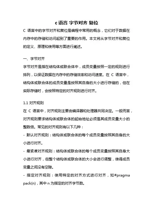 1.3 对齐示例下面以一个结构体为例,说明字节对齐的过程:```cstruct example {char c; // 1字节int i; // 4字节double d; // 8字节};```根据默认对齐规则,该结构体的大小为1字节+4字节+8字节=13字节。