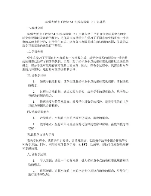 华师大版七下数学7.4实践与探索(1)说课稿一. 教材分析华师大版七下数学7.4实践与探索(1)主要包括了平面直角坐标系中点的坐标变化规律以及函数的概念。