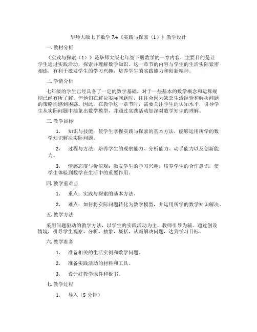 华师大版七下数学7.4《实践与探索(1)》教学设计一. 教材分析《实践与探索(1)》是华师大版七年级下册数学的一章内容,主要目的是让学生通过实践活动,探索并理解数学知识。