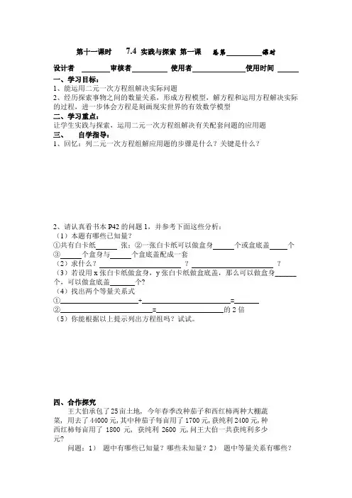 第十一课时7.4 实践与探索第一课总第课时设计者审核者使用者使用时间一、学习目标:1、能运用二元一次方程组解决实际问题2、经历探索事物之间的数量关系,形成方程模型,解方程和运用方程解决实际的过程,进一步体会方程是刻画现实世界的有效数学模型二、学习重点:让学生实践与探索,运用二元一次方程组解决有关配套问题的应用题三、自学指导:1、回忆:列二元一次方程组解应用题的步骤是什么?关键是什么?2、请认真看书本P42的问题1,并参考下面这些分析:(1)本题有哪些已知量?①共有白卡纸张;②一张白卡纸可以做盒身个或盒底盖个③个盒身与个盒底盖配成一套(2)求什么???(3)若设用x张白卡纸做盒身,y张白卡纸做盒底盖,那么可以做盒身______个,可以做盒底盖_______个?(4)找出两个等量关系式①______________________+_________________________=_______②__________________________=___________________的2倍(5)你能根据以上提示列出方程组吗?试试。