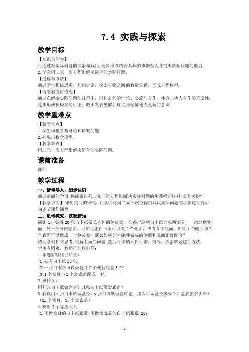 7.4实践与探索教学目标知识与技能1.通过思考、讨论、探索事物之间的数量关系,形成方程模型.2.通过自主探究,相互交流,尝试用二元一次方程组解决与生活密切相关的问题.过程与方法1.经历用方程组解决实际问题的过程,体会方程组是刻画现实世界的有效数学模型,培养分析、抽象、求解的能力.2.进一步经历用方程组解决实际问题的过程,体会方程组是刻画现实世界的有效数学模型.情感、态度与价值观1.学会开放性地寻求设计方案,培养分析解决问题的能力,体会到用数学知识解决实际问题的应用性.2.培养学生勤于思考,勇于探索的精神,感受到学习数学的目的是用数学知识解决实际问题.重点难点重点1.探索用二元一次方程组解决有关应用题.2.探索用方程或方程组解决几何图形中的数量关系.难点1.分析题目中所蕴含的数量关系.2.分析图中的等量关系.教学过程一、创设情境设计意图:以学生身边的实际问题展开讨论,突出数学与现实世界的联系,培养学生用数学的意识.师:前面我们初步体验了用方程组解决实际问题的全过程,其实生产、生活中还有许多问题也能用方程组解决.教师利用投影出示问题:据以往的统计资料,甲、乙两种作物的单位面积产量的比是1∶1.5,现要在一块长200m,宽100m的长方形土地上种植这两种作物,怎样把这块地分为两个长方形,使甲、乙两种作物的总产量的比是3∶4(结果取整数)?设计意图:以学生身边的实际问题展开讨论,突出数学与现实的联系,激发学生的学习兴趣.师出示教材42页问题2:小明在拼图时,发现8个一样大小的长方形,如图(1)那样,恰好可以拼成一个大的长方形,小红看见了,说:“我来试一试.”结果小红七拼八凑,拼成如图(2)那样的正方形,怎么中间还留了一个洞,这个洞恰好是边长为2cm的小正方形.你能帮他们解开其中的奥秘吗?二、探索分析,研究策略设计意图:多角度分析问题,多策略解决问题,提高思维的发散性.师:以上问题有哪些解法?学生自主探索、合作交流,整理思路.(1)先确定有两种方法分割长方形,再分别求出两个小长方形的面积,最后计算分割线的位置;(2)先求两个小长方形的面积比,再计算分割线的位置;(3)设未知数,列方程组求解……学生经讨论后发现列方程组求解较为方便.设计意图:引导学生探寻解题思路,培养学生有条理地思考、表达的习惯,从而学会从多角度考虑问题.教师引导学生进行探究,可沿以下思路进行:①从图(1)中可以观察得出小长方形的长xcm 与宽ycm 之间的一种等量关系是什么?⑦从图(2)中能否得出x 与y 之间的另一种等量关系是什么?学生可以思考,交流、讨论,从而得出①3x =5y ,②x +2y =2x +2.构成方程组⎩⎪⎨⎪⎧3x =5y ,x +2y =2x +2;解之得:⎩⎪⎨⎪⎧x =10,y =6. 师问:请用以上的计算结果解释其中的奥秘.学生交流讨论出问题的结论:8个小长方形的面积之和为:8×10×6=480(cm 2). 大正方形的面积为(x +2y )2=484cm 2,所以小红拼出的大正方形中间还留下了一个恰好是边长为2cm 的小正方形.三、合作交流,解决问题,巩固应用设计意图:比较分析,加深对方程组的认识.画图、数形结合,辅助学生分析,进一步渗透模型化的思想.引发学生思考,寻求解决途径.师:引导学生回顾列方程解决实际问题的基本思路:(1)设未知数;(2)找相等关系;(3)列方程组;(4)检验作答.如图,一种方案为:甲、乙两种作物的种植区域分别为长方形AEFD 和BCFE.设AE =xm ,BE =ym ,根据问题中涉及长度、产量的数量关系,列方程组:⎩⎪⎨⎪⎧x +y =200,100x ∶(1.5×100y )=3∶4.解这个方程组得⎩⎨⎧x =1051517,y =94217,即⎩⎪⎨⎪⎧x ≈106,y ≈94. 过长方形土地的长边上离一端约106m 处,把这块地分为两个长方形.较大一块地种甲作物,较小一块地种乙作物.你还能设计别的种植方案吗?用类似的方法,可沿平行于线段AB 的方向分割长方形. 教师巡视、指导,师生共同讲评.设计意图:对应练习是对学生学习效果的检验,也进一步培养学生分析解决问题的能力.师用投影出示问题:如图,某单位为美化环境,准备将一块周长为76m的长方形草地,设计分成长和宽分别相等的9块小长方形,种上各色花卉,经市场预测,绿化每平方米造价为108元.①求出每个小长方形的长和宽;②计算完成每次绿化工程预计投入多少资金?四、拓展探究,综合应用设计意图:以学生学习生活中遇到的问题展开讨论,巩固用二元一次方程组解决实际问题的一般过程,并不断提高分析问题的能力.安排开放题,以利于培养学生探索精神和创新意识.学生在手工实践课中,遇到这样一个问题:要用20张白卡纸制作包装纸盒,每张白卡纸可以做盒身2个,或者做盒底盖3个,如果1个盒身和2个盒底盖可以做成一个包装盒,那么能否将这些白卡纸分成两部分,一部分做盒身,一部分做盒底盖,使做成的盒身和盒底盖正好配套?请你设计一种分法.按以下步骤展开问题的讨论:(1)学生独立思考,构建数学模型;(2)小组讨论达成共识;(3)学生板书讲解;(4)对方程组的解进行探究和讨论,从而得到实际问题的结果;(5)针对以上结论,你能再提出几个探索性问题吗?五、小结提高,布置作业设计意图:分层次布置作业,其中“必做题”面向全体学生,巩固知识,方法,加深理解,而“选做题”面向部分学有余力的学生,给他们一定的时间和空间,相互合作,自主探究,增强实践能力.师提问:通过本节课的讨论,你对用方程解决实际问题的方法又有何新的认识?学生思考后回答,整理.