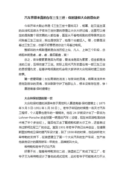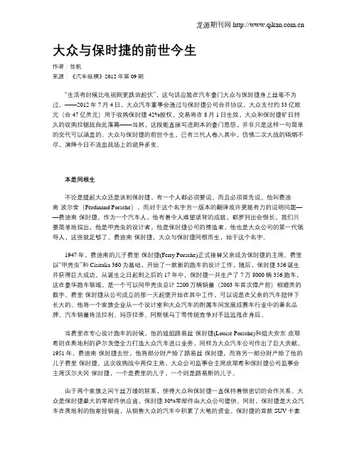 大众与保时捷的前世今生作者:张帆来源:《汽车纵横》2012年第09期“生活有时候比电视剧更跌宕起伏”,这句话应验在汽车豪门大众与保时捷身上丝毫不为过。