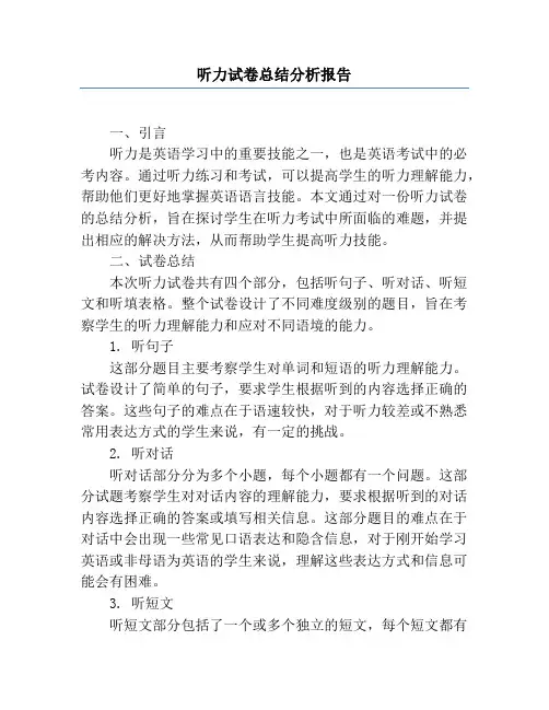 听力试卷总结分析报告一、引言听力是英语学习中的重要技能之一,也是英语考试中的必考内容。