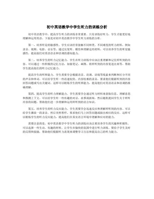 初中英语教学中学生听力的训练分析1. 引言1.1 初中英语教学中学生听力的训练分析Introduction:In the realm of middle school English teaching, the training of students' listening skills plays a crucial role in facilitating their overall language acquisition. By focusing on improving students' listening abilities, educators are able to enhance their comprehension, pronunciation, vocabulary, and communication skills in the target language. This analysis will delve into the significance of student listening training, the characteristics of students' listening abilities, effective methods for enhancing listening skills, the application of listening training in middle school English teaching, and important considerations to keep in mind during the process. By understanding and implementing strategies to improve student listening, teachers can create a more dynamic and engaging learning environment that fosters linguistic development and intercultural communication. Ultimately, this analysis aims to provide valuable insights into the importance of listening training in middle school Englisheducation and offer practical guidance for educators seeking to optimize their teaching practices.2. 正文2.1 学生听力训练的重要性学生听力训练在初中英语教学中扮演着至关重要的角色。