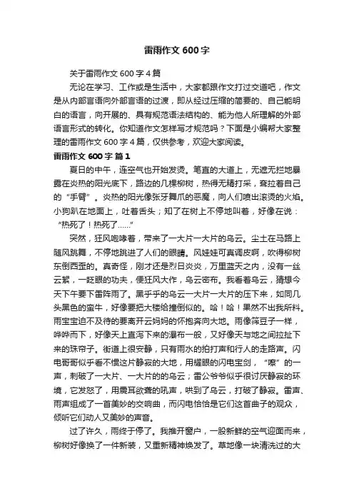 雷雨优秀作文600字雷雨优秀作文600字四篇在平时的学习、工作或生活中,大家总少不了接触作文吧,作文是经过人的思想考虑和语言组织,通过文字来表达一个主题意义的记叙方法。
