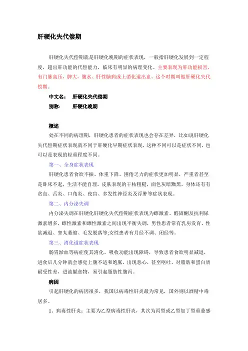 肝硬化失代偿期肝硬化失代偿期就是肝硬化晚期的症状表现,一般指肝硬化发展到一定程度,超出肝功能的代偿能力,临床有明显的病理变化。