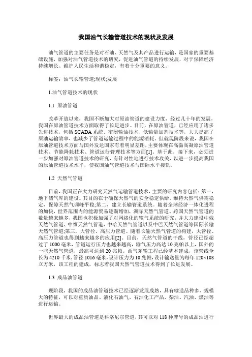 一、现状分析在当前的油气管道技术领域,随着国家对油气资源开发利用的逐步深入,管道技术应用越来越广泛,相应的管道技术也得到了进一步发展。