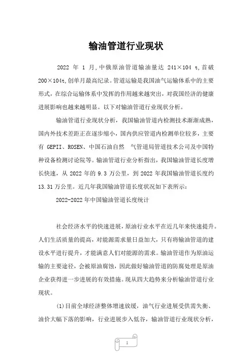 原油管道现状分析报告原油管道是将原油从产地运输到炼油厂或终端用户的重要设施,对保障能源供应和经济发展具有重要意义。