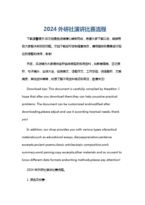 文档下载后可定制随意修改,请根据实际需要进行相应的调整和使用,谢谢!并且,本店铺为大家提供各种各样类型的实用资料,如教育随笔、日记赏析、句子摘抄、古诗大全、经典美文、话题作文、工作总结、词语解析、文案摘录、其他资料等等,如想了解不同资料格式和写法,敬请关注!Download tips: This document is carefully compiled by theeditor. I hope that after you download them,they can help yousolve practical problems. The document can be customized andmodified after downloading,please adjust and use it according toactual needs, thank you!In addition, our shop provides you with various types ofpractical materials,such as educational essays, diaryappreciation,sentence excerpts,ancient poems,classic articles,topic composition,work summary,word parsing,copy excerpts,other materials and so on,want to know different data formats andwriting methods,please pay attention!2024 年外研社演讲比赛流程。