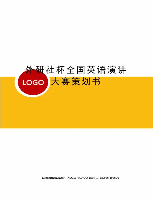 外研社杯全国英语演讲大赛策划书The latest revision on November 22, 2020活动资料外国语学院分团委学生会2015年10月目录一、活动背景 (3)二、活动目的 (3)三、活动主题 (3)四、活动负责人 (3)五、活动时间 (4)六、活动地点 (4)七、活动对象 (4)八、活动形式 (4)九、活动流程……………………………………第5-7页初赛:……………………………………第5-7页决赛:……………………………………第7-9页十、奖项设置 (9)十一、经费预算 (9)十二、注意事项 (9)十三、附件……………………………………第9-11页初赛:附件一:评分要求 (11)附件二:评分表 (11)附件三:报名表 (12)复赛:评分要求………………………………第13-14页评分表 (15)一、活动背景2015年5月13日,由外语教学与研究出版社联合教育部高等学校大学外语教学指导委员会、教育部高等学校英语专业教学指导分委员会联合主办的2015“外研社杯”全国英语演讲大赛、写作大赛、阅读大赛在北京正式启动。