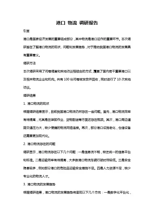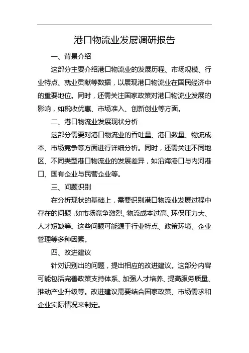 港口物流调研报告港口物流调研报告一、调研目的本次调研的目的是了解港口物流行业的现状、发展趋势以及存在的问题和挑战,为相关行业提供参考和依据。