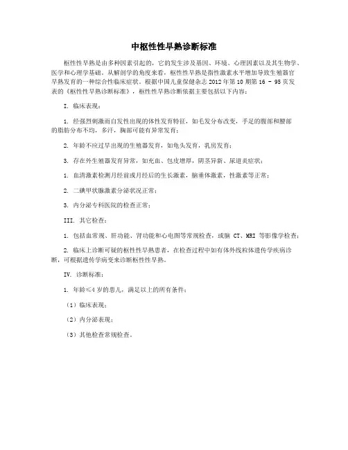 中枢性(真性)性早熟诊治指南中华医学会儿科学分会内分泌遗传代谢学组性早熟是儿科内分泌系统的常见发育异常,为了规范中枢性(真性)性早熟的诊断和治疗,中华医学会儿科学分会内分泌遗传代谢学组进行了专题讨论,制定以下指南供临床参考。