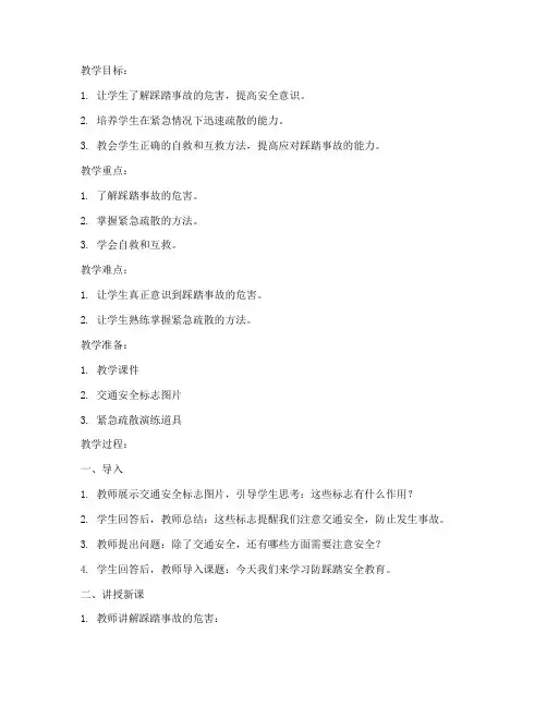 教学准备:1. 多媒体课件2. 安全教育视频3. 实物演示教具(如人形卡片、障碍物等)教学过程:一、导入1. 教师通过讲述踩踏事故的新闻案例,引导学生了解踩踏事故的危害。