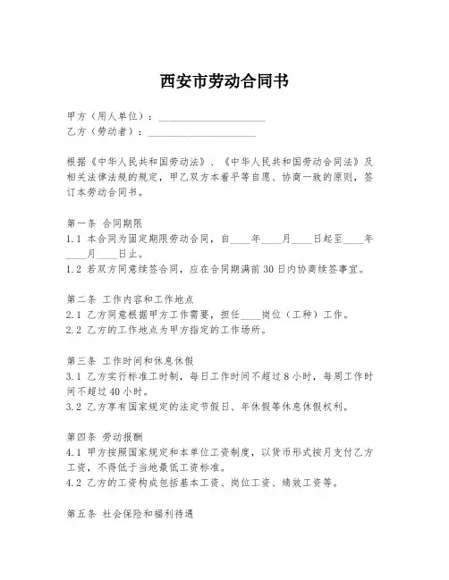 西安市劳动合同书甲方(用人单位):_____________________乙方(劳动者):_____________________根据《中华人民共和国劳动法》、《中华人民共和国劳动合同法》及相关法律法规的规定,甲乙双方本着平等自愿、协商一致的原则,签订本劳动合同书。