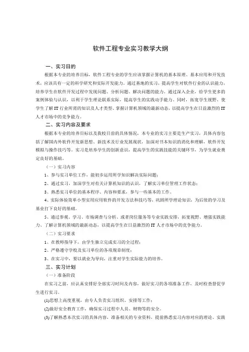 软件工程专业实习教学大纲一、实习目的根据本专业的培养目标,软件工程专业的学生应该掌握计算机的基本原理、基本应用和开发技术,应该具有一定的科学研究和实际开发能力。