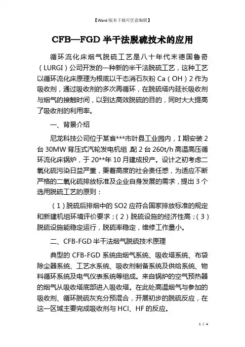 烟气循环流化床脱硫CFB-FGD技术简介1. 概况烟气循环流化床(CFB)脱硫技术在最近几年中已有所发展,不但用户增多,而且系统的烟气处理能力也比过去增大了,达到950,000Nm3/h,用于300MW机组的烟气脱硫系统。