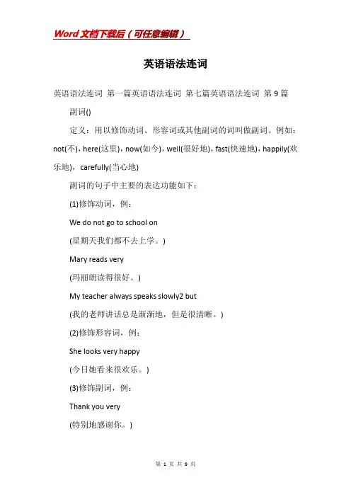 英语语法连词英语语法连词第一篇英语语法连词第七篇英语语法连词第9篇副词()定义:用以修饰动词、形容词或其他副词的词叫做副词。