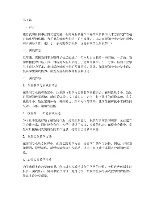 一、新闻学专业实践教学的重要性1. 提高学生的新闻素养新闻学专业实践教学能够使学生深入了解新闻行业的基本规律、新闻价值观和新闻职业道德,从而提高学生的新闻素养。