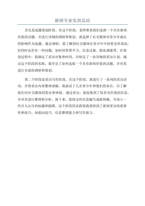 二、新闻采访1. 筹备工作在进行新闻采访前,我首先了解并研究采访对象、主题和背景资料,为采访做好准备。