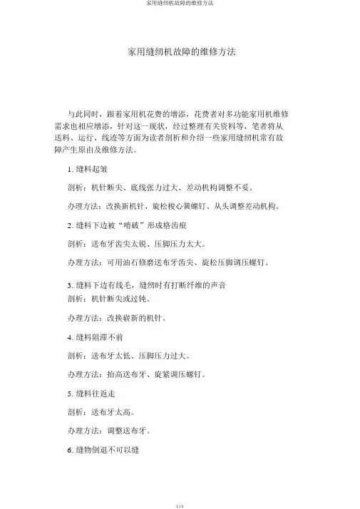 电动缝纫机的常见故障与维修电动缝纫机是现代家庭必备的一种家用电器,它能够为我们提供便捷高效的缝纫服务。