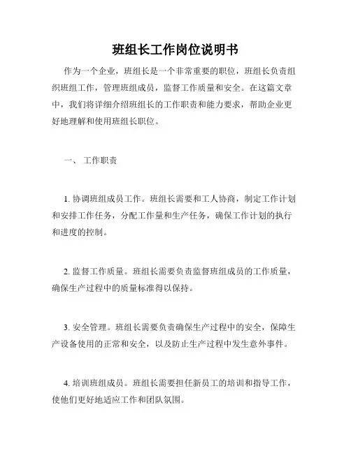 班组长岗位说明书班组长岗位说明书一、岗位概况班组长是一种领导职务,通常用于组织工人完成生产任务。