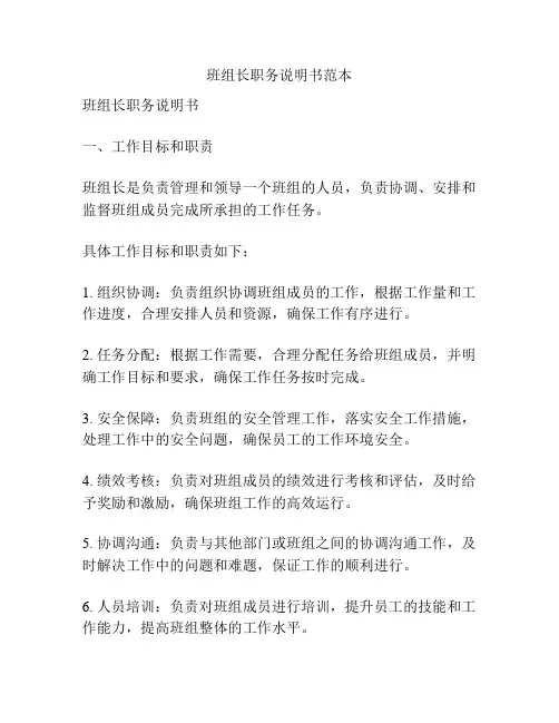 班组长职务说明书范本班组长职务说明书一、工作目标和职责班组长是负责管理和领导一个班组的人员,负责协调、安排和监督班组成员完成所承担的工作任务。